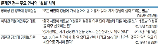 그러나 김 보좌관의 발언은 문재인 정부가 민생·경제 악화를 해소하지 못한 가운데 청년 실업과 조기퇴직으로 어려움을 겪고 있는 20∼30대 청년층과 50∼60대 장년층을 겨냥했다는 점에서 파장이 쉽게 가라앉지 않을 것으로 보인다. 올 들어 문 대통령이 자영업자와 중소기업 등을 달래며 “체감할 수 있는 경제 성과”를 강조한 가운데 청와대 참모가 ‘해선 안 되는 실언’을 했기 때문이다. 앞선 정부에서에도 특정 계층이나 집단을 폄훼하거나 비하한 경우 그 여파가 쉽사리 사그라지지 않았다. 노무현 정부 때는 여당인 열린우리당 정동영 의장이 17대 총선을 앞두고 노인 폄훼 발언으로 비례대표 후보직에서 사퇴했고, 이명박 정부 때는 추부길 청와대 홍보기획비서관이 ‘사탄 무리’ 발언으로 자리에서 물러났다.