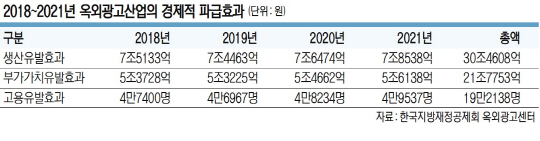 옥외광고산업이 2018년부터 2021년까지 4년간 생산유발 효과 30조4608억 원에다 19만2138명을 고용할 것이라는 전망이 나왔다.