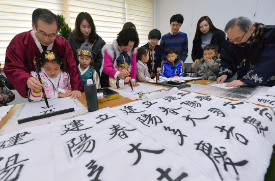 입춘(立春)을 일주일 앞둔 28일 광주 북구청 민원실에서 북구노인복지센터 서예반 회원들이 어린이와 주민에게 가정의 평안과 행복을 기원하는 ‘입춘대길(立春大吉)·건양다경(建陽多慶)’이라는 문구로 입춘방 쓰는 법을 알려주고 있다.