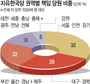 이날 한국당에 따르면, 1월 현재 전체 책임당원 수는 약 32만7000여 명으로 집계됐다. 권역별로는 영남권 비중이 압도적으로 높았다. TK 지역의 책임당원 수는 9만3000여 명으로 전체의 약 28%를 차지했다. 또 PK 및 제주 지역도 7만2000여 명(약 22%)을 기록해 영남권 책임당원 수는 전체의 절반을 넘어서는 것으로 나타났다. 서울·인천·경기 등 수도권은 10만5000여 명으로 약 32%를 차지했으며 대전·세종·충남·충북 등 충청권과 광주·전남·전북 등 호남권은 4만2000여 명(약 13%)을 차지했다.