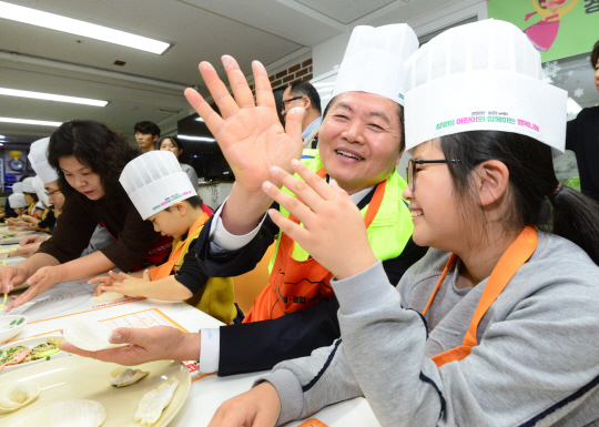 김병원(가운데) 농협중앙회 회장이 31일 오전 서울 용산구 후암동 아동복지시설 혜심원에서 열린 사랑의 먹거리 나눔봉사활동에서 어린이들과 함께 전통먹거리 체험을 하며 하이파이브를 하고 있다.