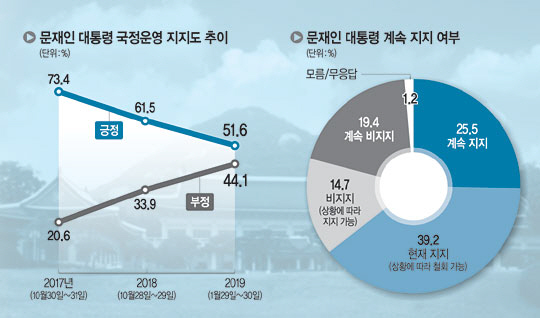 1일 문화일보의 설 특집 여론조사에서 문 대통령의 국정운영에 대해 ‘잘한다’는 응답은 지난해 문화일보 창간 특집 조사(11월 1일) 당시(61.5%)보다 9.9%포인트 하락한 51.6%로 집계됐다. 반면 ‘잘 못한다’는 응답은 44.1%로, 같은 기간 10.2%포인트 올랐다.