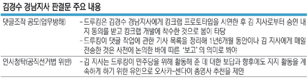 1일 김 지사의 판결문에 따르면 재판부는 드루킹이 2017년 대통령 선거 등에서 김 지사와 민주당을 위해 일했다는 점을 명확히 했다. 재판부는 김 지사가 이 과정에서 드루킹 측에 일본 오사카(大阪)나 센다이(仙臺) 총영사 자리를 제안, 드루킹이 댓글조작을 계속하도록 유인하며 범행 전반을 지배했다는 점도 확실히 했다. 킹크랩(댓글조작 자동화 프로그램) 역시 김 지사의 승인이나 동의를 받고 개발에 착수했다고 판단했다.