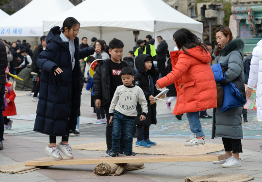 설 연휴 마지막 날인 6일 서울 종로구 새문안로 서울역사박물관에서 열린 설맞이 한마당 행사에 참여한 어린이들이 널뛰기를 하고 있다.