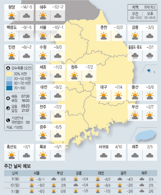 전국에 가끔 구름이 많겠다. 아침 최저기온은 영하 15도에서 영하 2도, 낮 최고기온은 영하 2도에서 영상 7도가 되겠다.