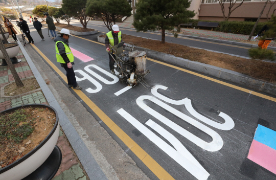 11일 광주 북구 우산동의 한 아파트 단지 입구에 소방 출동 시 신속한 위치파악을 돕기 위한 표시선인 ‘컬러 라인(COLOR LINE)’이 그려지고 있다. 광주 북구소방서는 소방서 자체 특수 시범사업으로 전국 최초로 아파트 단지 입구에 소방 출동로 표시선을 그렸다.