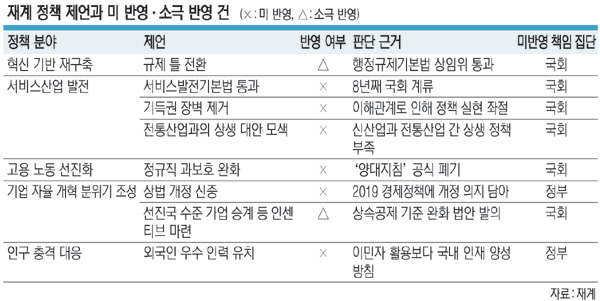 이후 대한상의가 후속 조치를 점검해 정책 반영도를 분석한 결과, 서비스 부문 정책 반영률이 0%로 집계돼 가장 저조했다. 실제 서비스산업발전기본법은 경제계의 조속한 입법 촉구에도 무려 8년째 국회에 계류 중이고, 기득권 장벽 제거와 전통산업과의 상생 대안 모색 등도 성과가 없는 상황이다. 고용·노동 선진화와 기업 자율개혁 분위기 조성, 인구충격 대응은 일부만 정책에 반영되거나 논의가 일정 부분 진행된 것으로 평가됐다. 정책 주체별로 분석한 결과, 반영된 제언 8건 가운데 6건은 정부가 지지 역할을 했고 국회가 주도한 것은 2건에 그쳤다. 반면 반영되지 않은 제언 8건 가운데 6건은 국회에서 이뤄지지 않은 것으로 나타나 국회의 ‘발목 잡기’가 여전한 것으로 분석됐다.