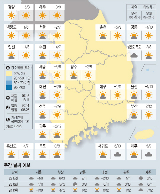 전국이 대체로 맑겠다. 아침 최저기온은 영하 8도에서 영상 2도, 낮 최고기온은 영상 6도에서 12도가 되겠다.