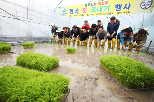 20일 경기 이천시 호법면 한 비닐하우스 내 논에서 열린 ‘임금님표 이천 쌀 전국 첫 모내기’ 행사 참가자들이 모를 심고 있다.