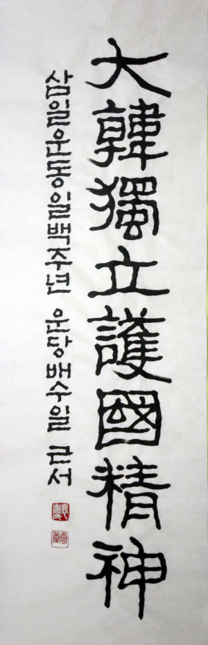 이동국 서울 예술의전당 서예박물관 수석 큐레이터는 “진흙에 철필로 파내듯 확고한 기운과 부동의 정신으로 써낸 예서체 글씨”라고 말했다. 배 씨는 “청력감퇴로 귀는 어두워졌지만 문화일보에서 세상 돌아가는 소식과 건강, 레저 취미 등의 정보를 얻고 있다”며 “기해년 3월 1일은 기미삼일운동 100주년이 되는 매우 의미깊은 날인 만큼 이날을 문화일보와 함께하고자 글씨 한 점을 드린다”고 말했다. 배 씨는 여초 김응현 선생을 사사했으며 1984년 서울미술제 서예부문 특선을 했다. 1985년 서울미술제 사진대상 수상 등 생태사진작가로도 활동해 왔다.