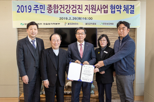 한국수력원자력 한울원자력본부가 경북 울진군보건소, 울진군의료원, 포항성모병원, 강원도 강릉아산병원과 함께 울진군 주민 2200명의 무료 종합건강검진을 위한 협약을 체결(사진)했다고 28일 밝혔다.