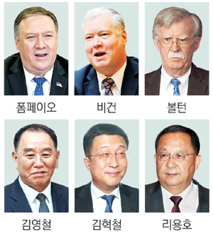 28일 베트남 하노이에서 열린 도널드 트럼프 미국 대통령과 김정은 북한 국무위원장 간의 ‘북핵 담판’에는 두 정상의 최측근 참모들이 배석했다. 미측에서는 마이크 폼페이오 국무장관, 북측에서는 김영철 노동당 부위원장이 배석하면서 두 사람이 미·북 관계를 총괄하는 최고 실무 책임자인 ‘키맨’임을 증명했다.