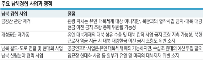 특히 남북 정상이 선결 과제로 내세운 개성공단·금강산 관광 재개는 유엔 대북 제재 결의안과 미국의 독자 제재 대북 결의안의 핵심 조항 대부분에 저촉된다. 일단 가장 대표적인 남북경협사업인 개성공단은 북한의 섬유 수출과 대북 합작을 전면 금지한 유엔 안전보장이사회 결의 2375호에 위배된다. 북한 근로자들에게 임금이 현금으로 지급되면 대북 대량현금 이전을 금지한 유엔 안보리 제재 결의안 위반 소지가 크다.