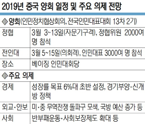 시 주석은 이 같은 국내외 상황을 감안해 이번 양회에서 공산당의 영도 강화와 함께 안정적이고 현실적인 경제 노선을 강조할 것으로 보인다. 5일 개막하는 전인대에서 중국 정부는 무역전쟁 여파로 성장률이 둔화하는 현실을 인정해 올해 성장률 목표치를 6%대 초반으로 잡으면서도 질적 성장 제고에 주력하겠다는 의지를 밝힐 것으로 예상된다. 런민르바오(人民日報) 등은 “고품질 성장, 금융 리스크 방지, 환경오염 개선, 빈곤 퇴치 등이 주요 이슈로 논의될 것”이라고 보도했다. 미·중 무역분쟁을 조기에 매듭짓기 위해 지식재산권 보호와 기술이전 강요 금지 등의 입법화 작업도 예상된다.