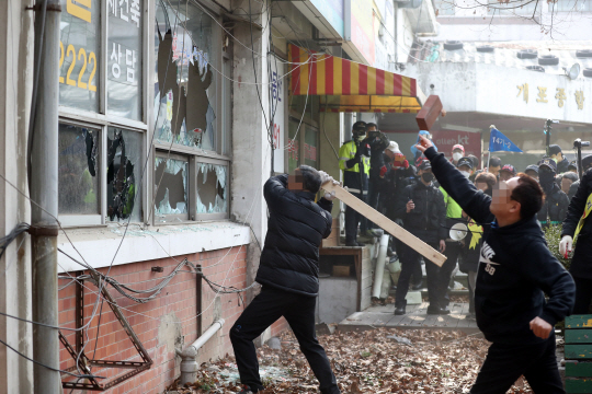 4일 오전 명도소송강제집행이 시도된 서울 개포종합상가 앞에서 개포주공1단지 재건축 조합원들이 상가 유리창을 부수고 있다.