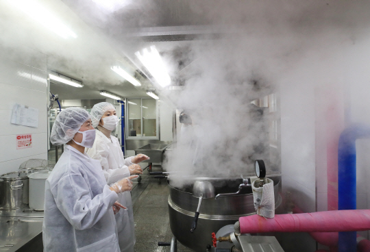 6일 오전 서울 서초구 언남초등학교에서 구청 위생과 직원들이 급식시설 위생점검을 하고 있다.