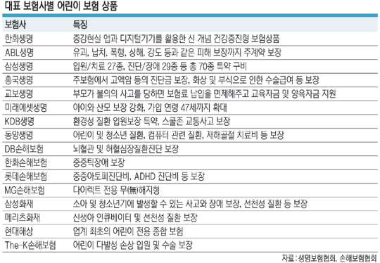◇갈수록 차별화하는 어린이 보험 = 경쟁은 곧 차별화를 만든다. 이는 어린이 보험에서도 적용되고 있다. 지난해 12월 출시된 한화생명의 어린이 보험은 보험업계 최초로 증강현실(AR) 앱과 디지털 기기를 활용한 신개념 건강증진형 상품으로 눈길을 끌었다. 아이의 양치습관을 AR 앱을 통해 측정하고, 목표를 달성하면 선물과 보험료 할인 등의 혜택을 주는 방식이다. 지난해 하반기 롯데손해보험이 내놓은 어린이 보험은 어린이에게 많이 발생하는 중증 아토피, 주의력 결핍 과잉 행동장애(ADHD), 호흡기 관련 질병 수술비, 피부질환 수술비 등 면역력 저하 및 환경적 요인으로 걸리기 쉬운 환경성 생활 질환을 집중적으로 보장한다. The-K손해보험은 신생아 시기보다 유소년 시기를 위한 보장을 늘린 상품을 지난해 출시했다. 인터넷전문은행인 케이뱅크도 ABL생명과 손잡고 모바일 전용 어린이 보험을 출시한 바 있다. KB국민은행도 역시 모바일을 통해 가입할 수 있는 어린이보험 상품을 시장에 내놓기도 했다. 상당수 상품은 성조숙증까지 보장하고 있다.