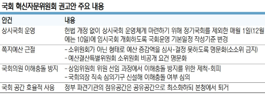 ◇상시국회로 전환 = 혁신자문위의 권고안 중 가장 눈에 띄는 것은 정기국회가 열리는 9∼11월을 제외한 나머지 달에도 매월 임시회를 소집하도록 국회법을 개정하는 것이다. 1기 혁신자문위의 상임위 상설 소위원회 설치권고와 맞물리면 국회는 사실상 상시국회로 전환되고 국회의 입법과 대정부 견제 등 본연의 기능도 대폭 강화될 전망이다. 현행 국회법에 2·4·6·8월에 임시국회를 열도록 명시돼 있음에도 여야가 정쟁으로 2월 내내 본회의 한 번 열지 못했다. 국회 관계자는 “상시국회는 제도뿐 아니라 300명 의원의 의지가 모여야 한다”고 말했다.