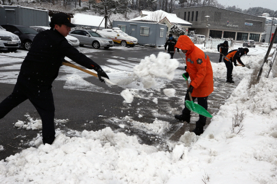 대설주의보가 내려진 7일 오전 강원 평창군 대관령면에서 소방서 직원들이 주차장에 쌓인 눈을 치우고 있다.
