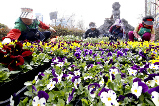 봄기운이 완연해지는 가운데 광주 북구청 공원녹지과 도시녹화팀 직원들이 7일 청사 광장에서 쾌적한 도심 환경 조성을 위해 봄꽃을 심고 있다.