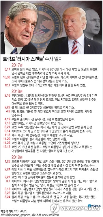 이로써 뮬러 특검팀의 ‘러시아 스캔들’ 수사는 22개월간의 대장정을 마치고 종지부를 찍었지만, ‘트럼프 대 반(反) 트럼프’간 명운을 건 일전이 펼쳐질 차기 대선정국에서 그 여진은 계속될 전망이다.