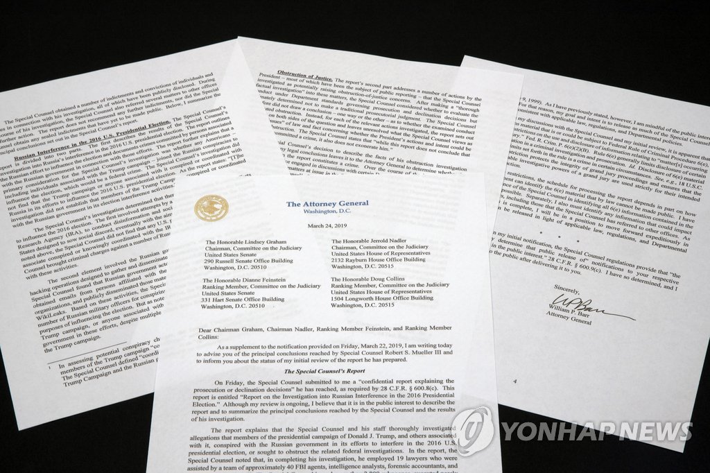 윌리엄 바 법무장관이 이날 하원 법사위에 제출한 특검 수사결과 보고서 요약본에 따르면 “특검팀의 수사는 트럼프 캠프 및 관련된 어떤 인사도 2016년 미국 대선에 영향을 미치려는 시도와 관련, 러시아와 연계된 인사들로부터 트럼프 캠프 지원을 위한 여러 제안이 있었음에도 러시아와 공모하거나 협력했다는 걸 찾지 못했다”고 미 언론들이 보도했다.