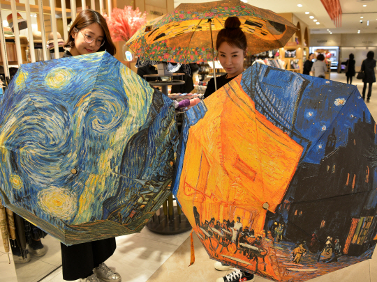 26일 롯데백화점 부산 본점에서 홍보도우미가 반 고흐의 ‘별이 빛나는 밤에’ ‘밤의 카페 테라스’ ‘오베르 쉬르 우아즈교회’와 르누아르의 ‘뱃놀이 일행의 오찬’ 등 명화가 새겨진 양산을 선보이고 있다.