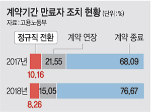 28일 고용노동부의 ‘2018년 하반기 기준 사업체 기간제 근로자 현황조사’에 따르면 지난해 12월 기준 계약 만료 기간제 근로자 4만6105명 가운데 정규직으로 전환돼 안정적인 일자리를 확보한 근로자 비율은 8.26%(3809명)로 집계돼 1년 전에 비해 1.90%포인트 하락했다. 2017년에는 계약 만료 기간제 근로자 3만9374명 중 10.16%(4001명)가 정규직으로 전환됐었다. 계약이 연장된 기간제 근로자 비율도 2017년 21.55%(8486명)에서 2018년 15.05%(6941명)로 6.50%포인트 줄어들었다. 반면 계약 종료로 실업 위기에 내몰린 기간제 근로자 비율은 2017년 68.09%(2만6810명)에서 2018년 76.67%(3만5349명)로 8.58%포인트 증가했다.