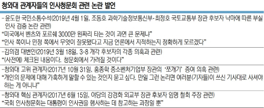 한편 청와대가 인사청문회 정국 때마다 안일한 상황 인식을 드러내며 화를 자초했다는 평가가 정치권 안팎에서 제기된다. 앞서 1기 청와대에서는 고위 관계자가 2017년 10월 홍종학 당시 중소벤처기업부 장관 후보자의 ‘쪼개기 증여’가 문제가 되자 “국세청 홈페이지에는 가장 합법적인 절차라고 소개돼 있다”며 “개인의 문제에 대해 가혹하게 말할 수 있는 것인지 묻고 싶다”고 발언해 논란을 자초했다.