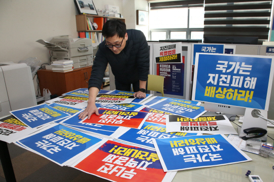 1일 경북 포항시 남구 효자동의 한 홍보물제작업체 직원이 ‘11·15 포항지진 범시민대책위원회’ 주최로 2일 시내 육거리 일원에서 열리는 특별법 제정 촉구 범시민궐기대회에 사용할 손팻말을 살펴보고 있다.