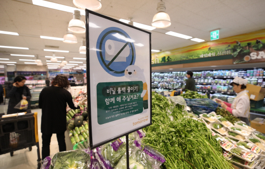 대형 마트, 백화점, 쇼핑몰 등에서 일회용 비닐 봉투 사용이 금지된 첫날인 1일 서울 용산구의 한 대형 마트 야채 코너에 비닐 봉투(비닐 롤백) 사용 자제를 알리는 안내문이 붙어 있다.