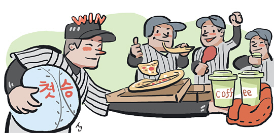 주로 첫승이 잔칫상의 주된 테마다. 그런데 첫승은 대부분 신인, 또는 저연봉자의 몫. 올해 연봉 2700만 원을 받는 신인 하재훈은 넉넉하지 않은 주머니 사정 탓에 1군 매니저에게 50만 원 상당의 피자 25판을 주문하면서 “3개월 할부로 주문해달라”고 부탁해 웃음을 유도했다. 하재훈은 “선수단에 한턱 내는 한국 특유의 정은 정말 좋은 전통”이라면서 “올해 개막전에서 의미 있는 첫승을 거뒀고, 그것을 기념하는 피자를 함께 먹으니 진짜 식구처럼 느껴진다”고 말하며 활짝 웃었다.