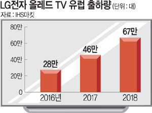 사업보고서에 따르면 LG전자는 지난해 유럽시장에서 올레드 TV를 약 67만 대를 판매했다. 이는 2017년(46만 대)에 견줘 46% 늘어난 수치다. 사실상 올레드 TV가 유럽 시장의 질적·양적 성장세를 이끌었다는 설명이다. 지역 매출 현황을 살펴보면 HE사업본부의 전체 매출액 16조2000억 원 중에서 유럽 매출 비중은 약 24%로 최대 시장인 북미(24%)와도 쌍벽을 이루는 수준으로 올라섰다.