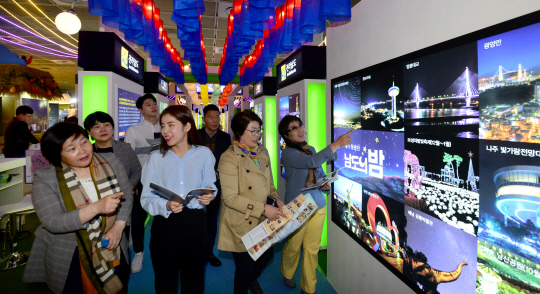 4일 오전 서울 강남구 삼성동 코엑스에서 개막한 ‘2019내나라여행 박람회’(4~7일)를 찾은 시민들이 자치단체 홍보 부스를 살펴보고 있다.