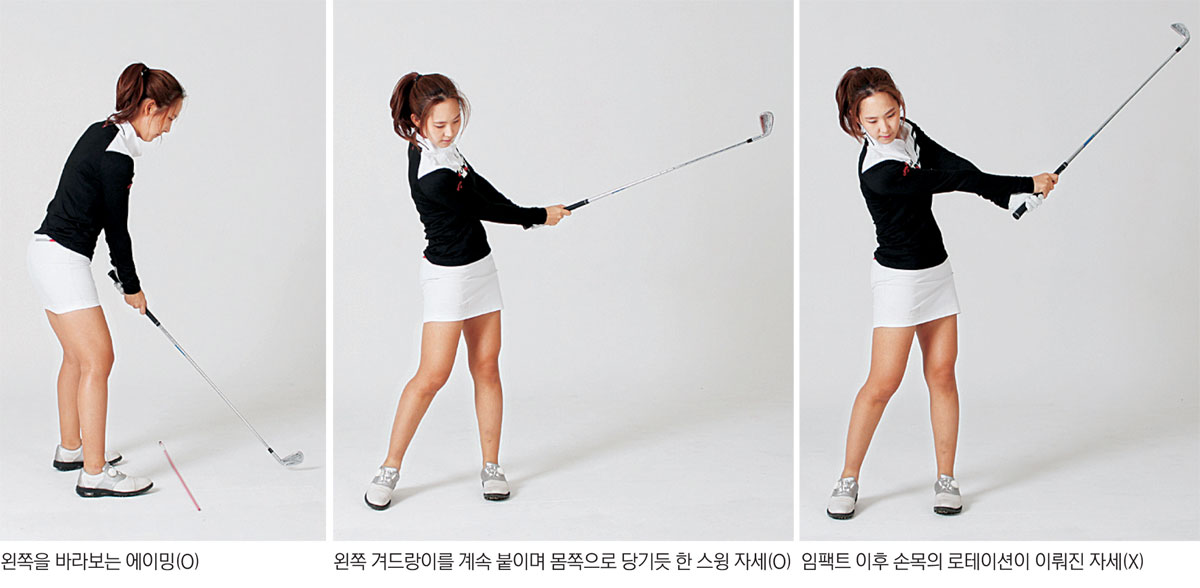 만약 로테이션 제어가 되지 않는다면, 퍼터 그립 잡듯이 왼손 검지를 오른손 위에 오도록 반대로 잡아보세요. 퍼트할 때에도 손목을 제어하기 위한 동작이며, 스윙 중 로테이션이 좀 더 지연될 수 있게 도와줍니다.