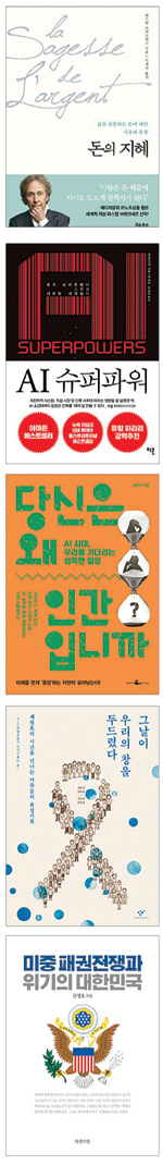 ★AI 슈퍼파워(리카이푸 지음, 박세정·조성숙 옮김/이콘)= 대만 출신으로 미국과 중국을 넘나들며 인공지능(AI) 연구·개발 및 투자 분야에서 30년 이상 종사해온 저자는 AI의 실체를 미·중의 AI 기업을 통해 들려준다. AI가 가져올 미래가 유토피아일지, 디스토피아일지는 우리의 준비에 달렸다고 강조한다. 424쪽, 1만6200원