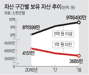 이 보고서에 따르면 2016년 이후 자산이 5억 원 이상인 고자산 가구는 매년 자산이 꾸준히 늘었다. 이들 고자산 가구의 평균 자산은 2017년에 전년 대비 13.5%, 지난해에는 전년 대비 5.5%가 증가해 2년 새 1억5891만 원(20%) 증가했다. 하지만 자산 1억 원 미만 저소득층 가구는 평균 자산이 2016년 4151만 원이었으나 매년 감소해 2017년 3840만 원, 지난해는 3685만 원으로 2년 새 466만 원이 쪼그라들었다.