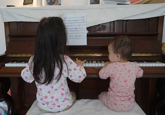 피아노를 막 배우기 시작한 큰 아이와, 언니가 하는 건 무조건 따라 하려는 작은 아이 간에 벌어진 건반 치기 배틀 감상에 들어갑니다.