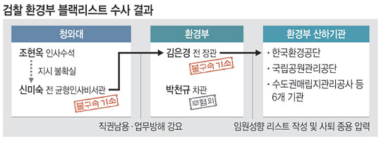 서울동부지검 형사6부(주진우 부장검사)는 전 정부에서 임명된 환경부 산하기관 인사에 청와대가 조직적으로 개입했다는 의혹과 관련해 수사를 벌였지만 신 전 비서관과 김은경 전 환경부 장관을 불구속 기소하는 선에서 25일 수사를 사실상 마무리하기로 했다. 검찰은 올해 1월 환경부 컴퓨터 압수수색에서 발견된 ‘장관 보고용 폴더’를 통해 김 전 장관의 혐의점을 포착했다. 해당 폴더에서 발견된 문건에는 전 정부에서 임명된 감사 대상 임원 이름 뒤에 ‘사퇴할 때까지 무기한 감사’ ‘거부 시 고발 조치 예정’ 등의 내용이 적혀 있었던 것으로 알려졌다. 앞서 피고발인 신분 검찰 조사에서 김 전 장관은 블랙리스트 등에 대해 ‘기억나지 않는다’는 취지로 해명했으나 검찰은 이 같은 증거를 바탕으로 김 전 장관에게 직권남용 혐의를 적용했다.