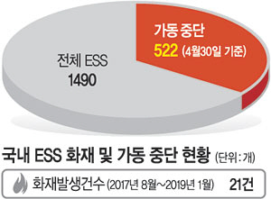 지난 2017년부터 지난 1월 22일까지 발생한 ESS 화재사고는 21건(2018년 5월 이후 20건)에 달한다. 정부가 조사 결과 발표 전까지 가동 중단을 권고함에 따라 지난달 30일 기준 전국 ESS 시설 1490개 중 35%인 522개가 가동을 멈춘 상황이다. 올해 들어 국내 ESS 신규 설치 발주는 사실상 한 건도 없는 것으로 알려졌다. 업계 관계자는 “이미 업체들의 피해가 막대한데, 또다시 원인 규명과 설치 기준 제시가 없는 상황이 장기화할 경우 ESS에 대한 불신이 커져 업계가 고사할 수도 있다”고 우려했다.