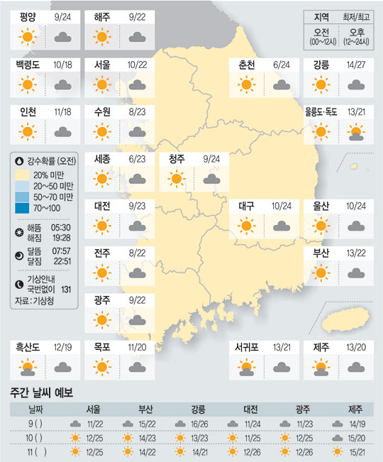 전국이 맑다가 오후부터 구름이 많아지겠다. 아침 최저기온은 5도에서 14도, 낮 최고기온은 18도에서 27도가 되겠다.