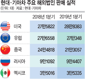 이처럼 현대·기아차가 글로벌 시장에서 나름대로 선방한 것은 시장 다변화 효과라는 분석이다. 현대·기아차는 미국, 유럽, 중국 외에도 인도, 러시아, 브라질, 멕시코 등지에 해외 법인·공장을 설립해 해외 판매 네트워크를 구축해 왔다. 현대차는 지난 1분기 러시아에서 지난해 같은 기간에 비해 판매 증가율 15.2%를 기록했다. 아프리카·중동과 아시아·태평양 지역 등 ‘기타 권역’에서도 4.2% 성장했다. 같은 기간 기아차는 멕시코에서 4.2% 판매 신장을 이뤘고, 유럽에서도 0.6% 성장세를 기록했다.