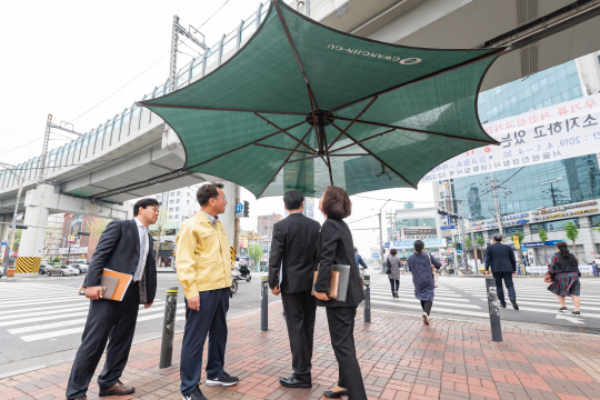 구는 이에 따라 폭염 주의보·경보 등 특보 발령 시 4개 반 15명으로 구성된 폭염 대책 종합상황실을 운영한다. 대책 상황실은 24시간 비상연락체계를 유지하고 폭염 피해에 따른 상황 조치를 취하게 된다. 기상청에 따르면 올여름 평균 기온이 평년보다 높고 북태평양 고기압의 영향으로 무더운 날씨가 이어질 것으로 전망된다. 구는 이런 상황을 감안해 한파 쉼터 20개소를 그늘막으로 전환·운영하고 접이식 그늘막도 10개 늘려 총 64개를 설치한다. 특히 지역 내 독거노인과 만성질환자 등 사회 소외계층을 위한 대책도 강화한다. 동별로 담당 방문 간호사를 배치하고 동 복지플래너·자원봉사자와 함께 취약계층에 대한 집중 모니터링을 실시토록 할 방침이다. 아울러 지역 경로당과 주민센터, 복지시설 96개소에도 어르신 무더위 쉼터를 마련해 오전 9시부터 오후 6시까지 운영한다. 김선갑(왼쪽 두 번째) 광진구청장은 “올해도 극심한 무더위가 예상돼 미리 피해 예방 활동에 나서게 됐다”며 “특히 사회 소외계층이 시원하고 안전한 여름을 보낼 수 있도록 만전을 기하겠다”고 말했다.