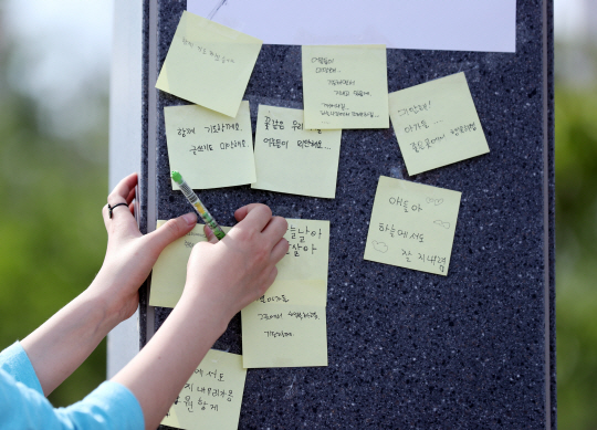16일 인천 연수구 송도국제도시 한 아파트단지 인근 공원에서 한 주민이 전날 어린이 축구 교실 차량과 승합차 추돌사고로 숨진 어린이 2명을 추모하며 적은 글을 추모 게시판에 붙이고 있다.