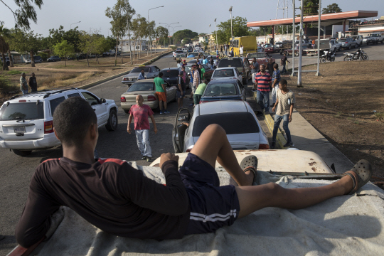 15일 베네수엘라 카비마스의 한 주유소 앞에 차량이 줄지어 서 있다. 미국의 제재 여파로 산유국 베네수엘라에서 기름을 넣기 위해 긴 줄이 형성되는 아이러니한 풍경이다.
