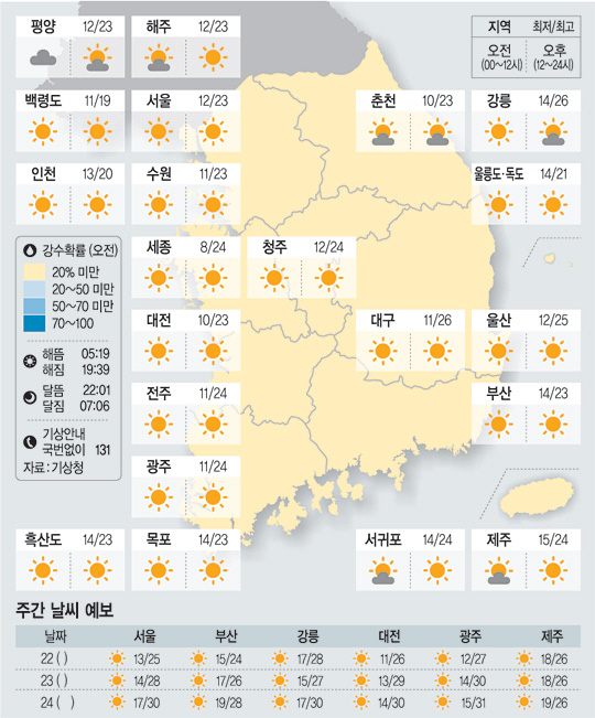 전국이 대체로 맑겠다. 경기 동부 지역과 강원 영서 지역은 낮 한때 구름이 많겠다. 아침 최저기온은 7도에서 14도, 낮 최고기온은 20도에서 26도가 되겠다.