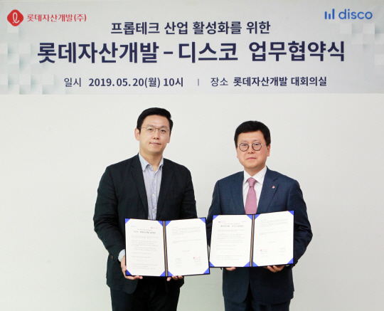 롯데자산개발은 20일 프롭테크(Proptech·정보 기술을 결합한 부동산 서비스 산업) 분야 스타트업인 ‘디스코’와 프롭테크 산업 활성화를 위한 양해각서(MOU)를 체결했다.