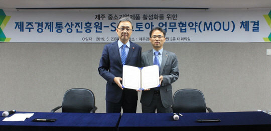 신양균(오른쪽) SK스토아 지원본부장과 문관영 제주경제통상진흥원 원장은 23일 제주시 연삼로 진흥원 본사에서 ‘제주도 중소기업 제품 활성화를 위한 업무협약’을 체결하고, 제주 지역 중소기업 및 사회적 기업들의 판로 확대에 적극적으로 나서기로 했다.