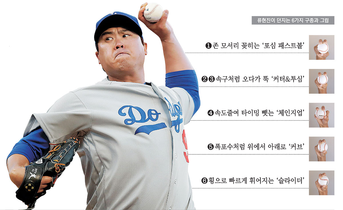 ‘코리안 몬스터’ 류현진(32·LA다저스·사진)의 전성시대다. 류현진은 28일까지 7승 1패, 평균자책점 1.65를 유지하고 있다. 다승은 내셔널리그 공동 1위이고, 평균자책점은 빅리그 선발투수 중 유일한 1점대다. 9이닝당 볼넷(0.55개)과 삼진/볼넷 비율(15.50) 등 세부 지표에서도 압도적인 1위를 달리고 있다. 류현진의 올해 포심패스트볼(직구)의 분당 평균 회전수는 2090회로, 리그 평균인 2285회보다 떨어진다. 올해 직구 평균 구속은 90.5마일(약 145㎞)로 리그 전체 평균인 93.2마일(약 150㎞)에 못 미친다. 하지만 류현진은 스트라이크존 곳곳에 공을 뿌리는 정교한 제구력, 그리고 변화무쌍한 구종으로 메이저리그에서 극찬을 받고 있다. 류현진은 6가지 구종을 던진다. 포심패스트볼과 투심패스트볼, 컷패스트볼 등 변형 직구에 체인지업과 슬라이더, 커브를 구사한다. 다양한 볼 배합에 정교한 제구력이 뒷받침되기에 그가 던진 공을 친다는 건 무척 어려운 일이다.
