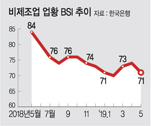 제조업과 달리 비제조업 업황 BSI는 71로 3포인트 하락했다. 광고 대행과 건설 엔지니어링 수요가 줄어든 영향으로 전문·과학·기술(69)에서 11포인트 하락했다. 신규 분양 감소, 부동산 개발 수요 부진 영향으로 부동산업(61)도 10포인트 내렸다. 광고와 부동산은 실제 경기침체의 ‘바로미터’로 불리는 만큼 불황의 적신호가 아니냐는 해석이 나온다.